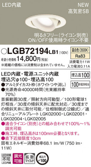 PANASONIC パナソニック ダウンライト LGB72194LB1