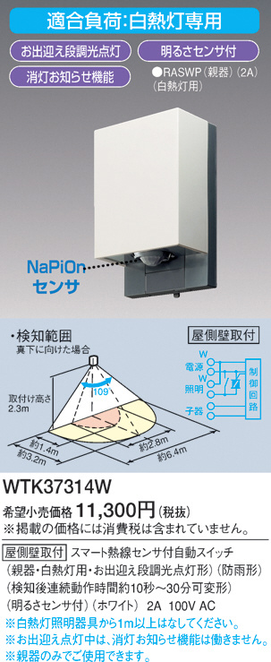 Panasonic スマート熱線センサ付自動スイッチ(屋側壁取付形) WTK37314W