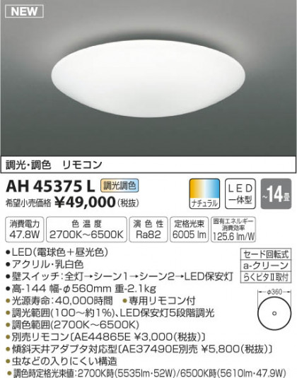 LED47.8W|●LED(電球色+昼光色)|●アクリル・乳白色|●壁スイッチ:全灯→シーン1→シーン2→LED保安灯|”●高-144 幅-φ560mm 重-2.1kg”|●消費電力:47.8W|●色温度:2700K〜6500K|●演色性:Ra82|”●定格光束:6,005 lm”|”●固有エネルギー消費効率:125.6 lm/W”|”●光源寿命:40,000時間”|●専用リモコン付|●調光範囲(100〜約1%)、LED保安灯5段階調光|●調色範囲(2700K〜6500K)|”●別売リモコン〔AE44865E ¥3,000(税抜)〕”|”●傾斜天井アダプタ対応型〔AE37490E別売 ¥5,800(税抜)〕”|●虫などの入りにくい構造|●調色時定格光束値:2700K時(5535lm・52W)/6500K時(5610lm・47.9W) 〜14畳