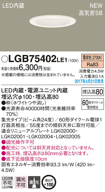 Panasonic LED ダウンライト LGB75402LE1