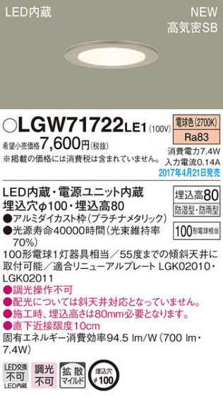 Panasonic LED ダウンライト LGW71722LE1