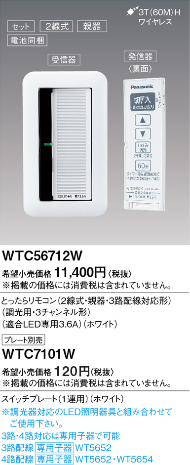Panasonic とったらリモコン(2線式・親器・3路対応形・調光LED専用3.6A) WTC56712W