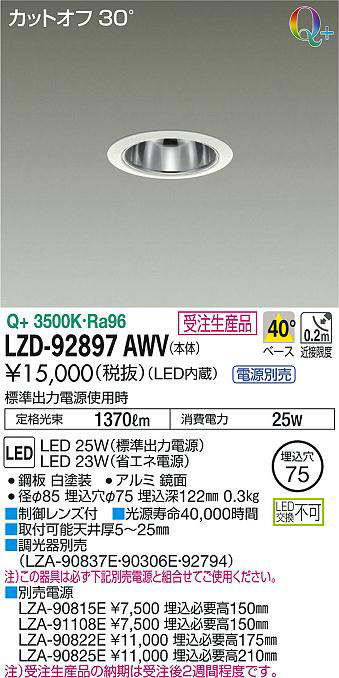 ■別売電源 LZA-90815E ¥7,500 埋込必要高150mm LZA-91108E ¥7,500 埋込必要高150mm LZA-90822E ¥11,000 埋込必要高175mm LZA-90825E ¥11,000 埋込必要高210mm、注)受注生産品の納期は受注後2週間程度です。、標準