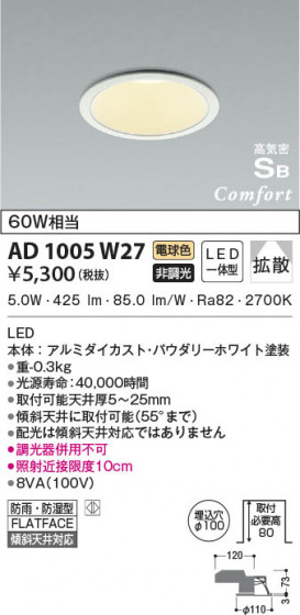 KOIZUMI コイズミ照明 高気密SBダウンライト AD1005W27