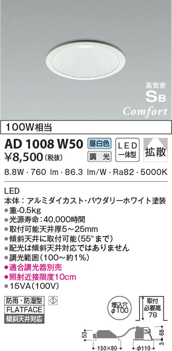 KOIZUMI コイズミ照明 高気密SBダウンライト AD1008W50
