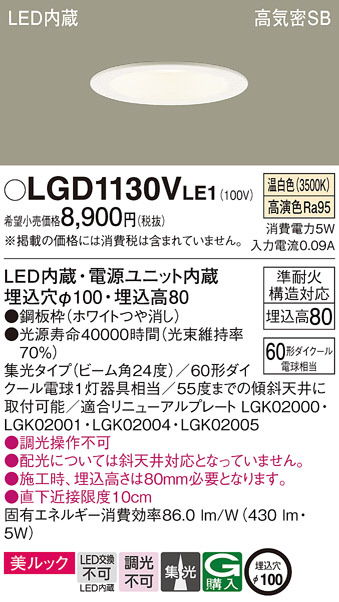 Panasonic ダウンライト LGD1130VLE1