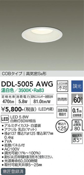 DAIKO 大光電機 ダウンライト(軒下兼用) DDL-5005AWG