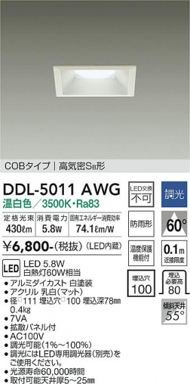 DAIKO 大光電機 ダウンライト(軒下兼用) DDL-5011AWG