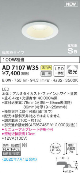 KOIZUMI コイズミ照明 高気密ダウンライト AD7107W35