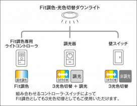 ●<調光範囲・調色範囲・光色切替>Fit調色別売専用調光器:調光範囲(100〜約3%)・調色範囲(2700K〜5000K)