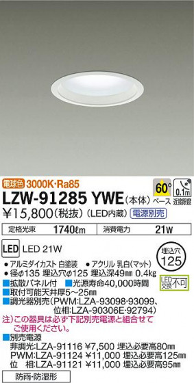 ■別売電源 非調光:LZA-91116 ¥7,500 埋込必要高80mm PWM:LZA-91124 ¥11,000 埋込必要高125mm 位相:LZA-91121 ¥11,000 埋込必要高95mm
