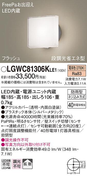 Panasonic エクステリアライト LGWC81306KLE1 | 商品情報 | LED照明器具・照明機器の激安通信販売・格安通販・業務用販売・見積もり販売 照明倉庫 -LIGHTING DEPOT-