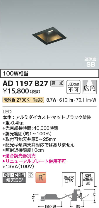 Koizumi コイズミ照明 LED高気密SBダウンライト AD1197B27