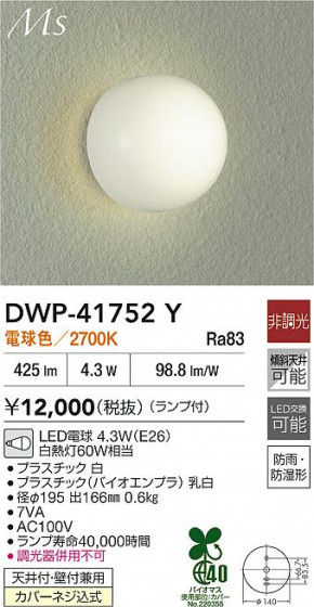 DAIKO 大光電機 浴室灯 DWP-41752Y
