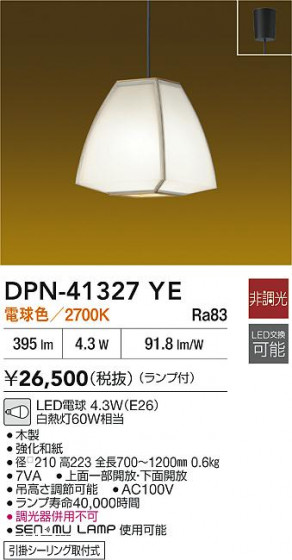 DAIKO 大光電機 和風小型ペンダント DPN-41327YE