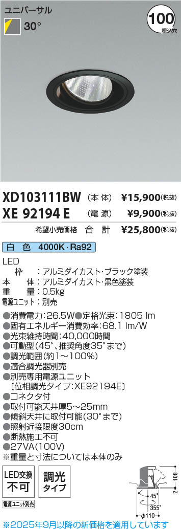 Koizumi コイズミ照明 LEDユニバーサルダウンライト 本体 XD103111BW