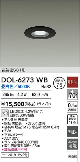 DAIKO 大光電機 LED軒下ダウンライト DOL-6273WB