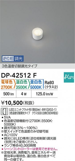LEDユニットフラット形(径60mm) 4W(GX53-1)3色温度切替調光タイプ クラス500(白熱灯60W相当) 電球色 2700K 温白色 3500K 昼白色 5000K
