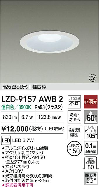 DAIKO 大光電機 LED 防雨・防湿形ダウンライト LZD-9157AWB2
